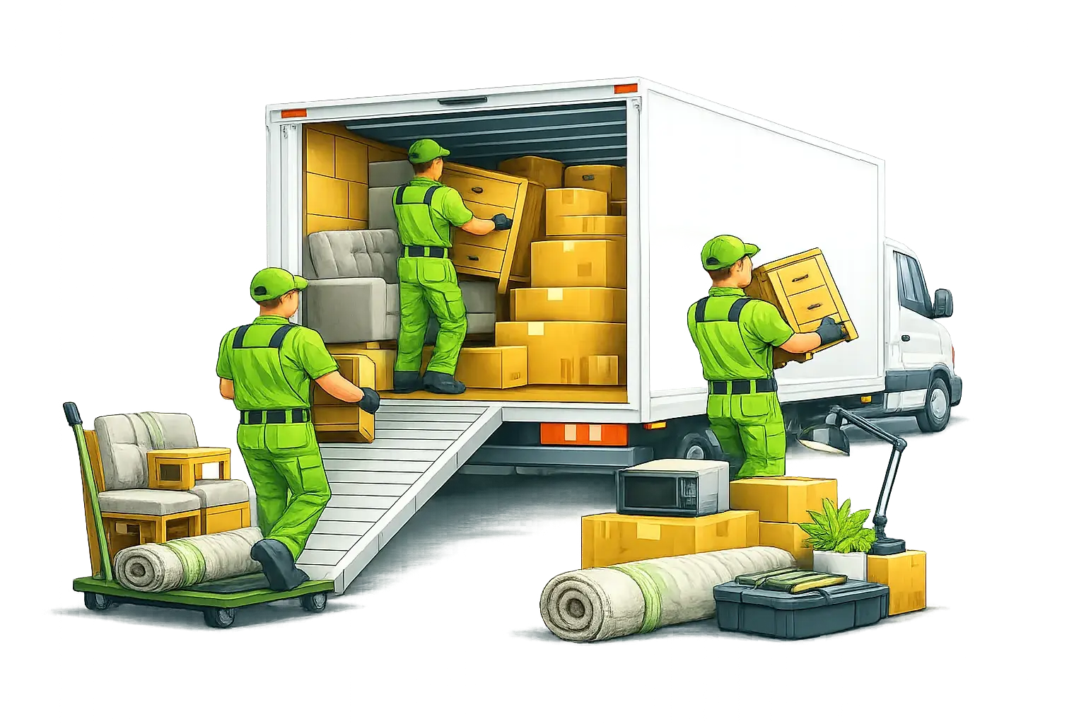 Стоимость зависит от объёма мебели, типа автомобиля, количества грузчиков, этажности, наличия лифта и дополнительных услуг.